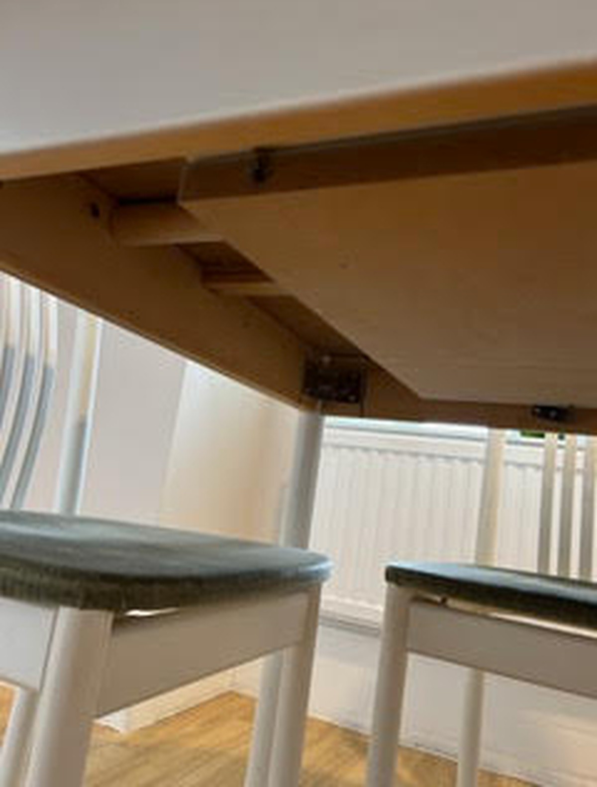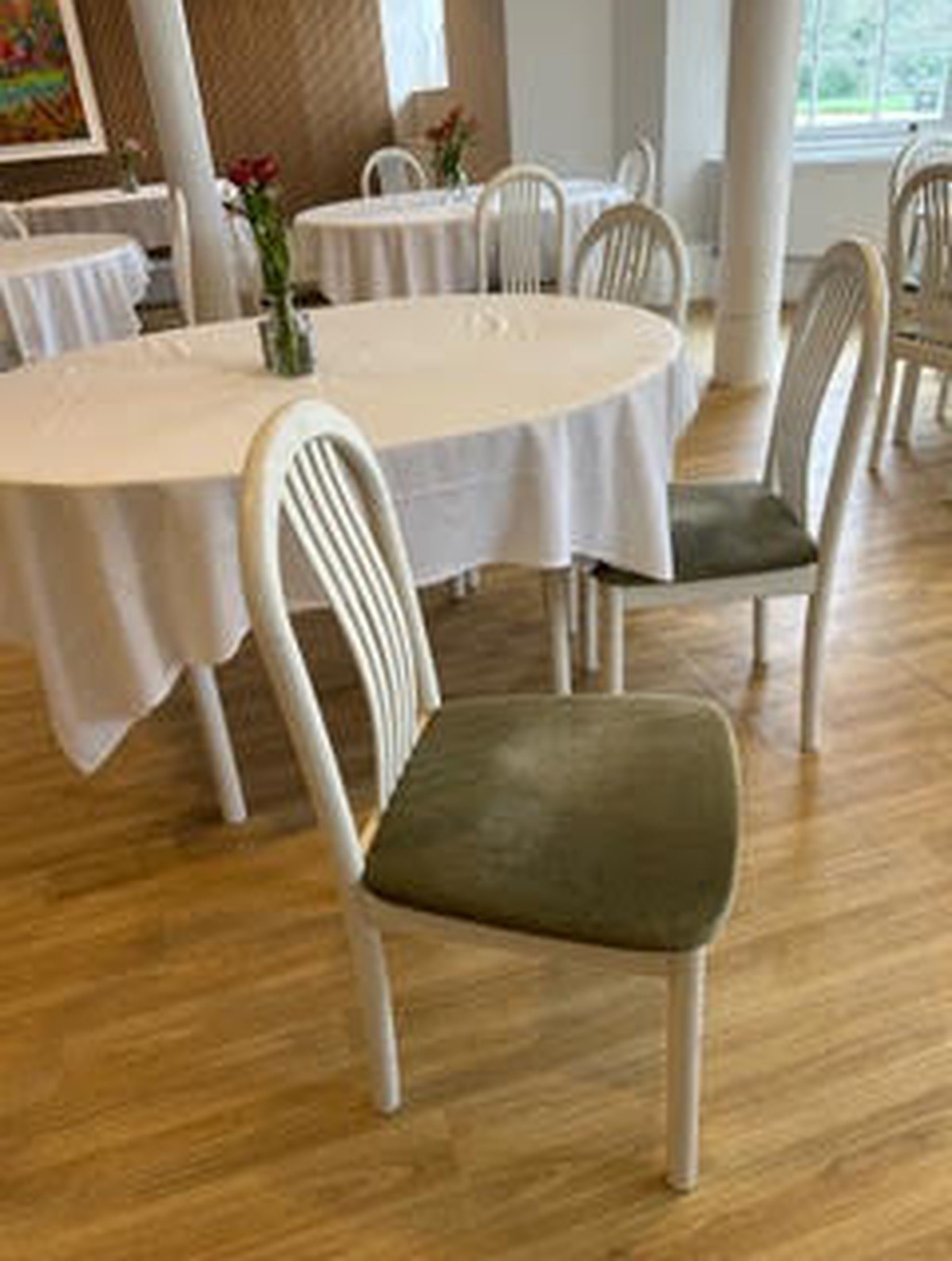 12x white round extendable tables.80x white round backed chairs with sage green velvet seats.